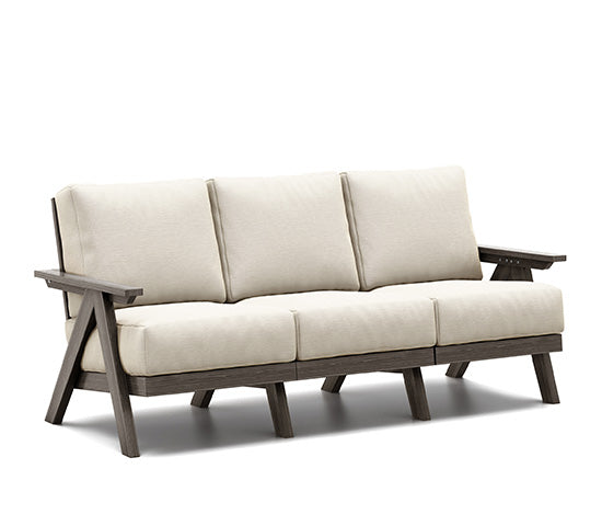 Transform your outdoor living space with the Ava Cushion Sofa by Homecrest. Designed with a rustic A-frame silhouette, this sofa captures the warmth of natural wood while delivering the long-lasting durability of HDPE. The frame is built to resist fading, rotting, and weathering, making it virtually maintenance-free. DreamCore cushions provide the perfect balance of plush comfort and lasting support while resisting mildew, stains, and quick wear. With a wide selection of frame finishes and cushion fabrics, this sofa is fully customizable to fit your style. Proudly made in the USA, the Ava Sofa combines craftsmanship, comfort, and resilience for an outdoor piece that invites you to relax and unwind.