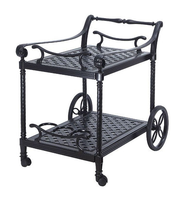 Bring luxury and elegance to your outdoor space with the Gensun Grand Terrace Cast Aluminum Serving Cart. Expertly cast and exquisitely detailed, it complements the classic design of the Grand Terrace collection while providing practical functionality. Roll food and drinks from kitchen to patio with ease on its sturdy shelves, while the durable cast aluminum construction ensures lasting beauty and weather resistance—perfect for entertaining or all-day outdoor lounging.