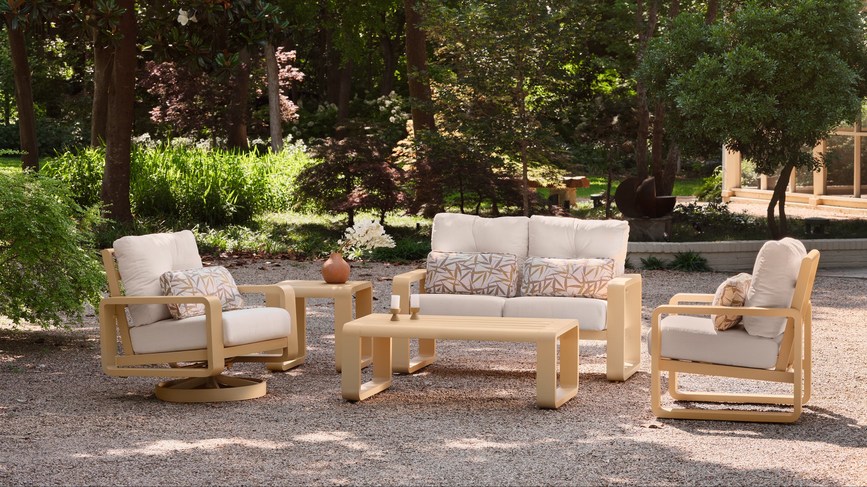 Elevate your outdoor space with the Woodard Vale Coffee Table, where contemporary style meets lasting durability. Crafted from rust-proof extruded aluminum, this table features a modern, boxy silhouette with wide legs for a sleek, sophisticated look. Available in a variety of all-weather powder coat finishes—from gleaming Sterling Silver to rich Ebony Black—this American-made table combines beauty, reliability, and effortless outdoor luxury.